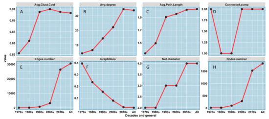 The network diameter for the 1970s and the 1980s is the same and equals two, while the 1990s and the 2000s is a little higher (i.e., 3), and 2010s, as well as the worldwide network, amounts to four. The average path distance length between a pair of vertices for all the five decades increased over time: 1.3 in the (1970s), 1.5 (1980s), 1.9 (1990s), 1.95 (2000s), and 2.20 (2010s).
