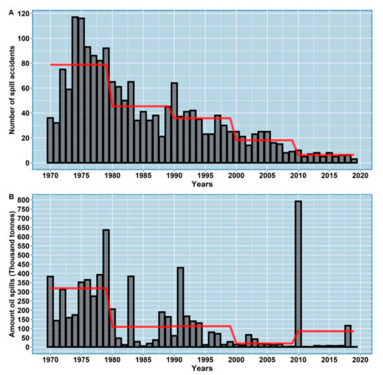 This result is based on the ITOPF data report [38] and the Max Roser database [39]. A general negative trend in the number of oil spills from tankers indicates a marked decrease of accidents with time (Figure 7A). A similar trend can be also seen in the amount of oil spills with time (Figure 7B) until 2010, when the Deepwater Horizon resulted in the worst oil disaster in oil drilling history, and then in 2018 off the Shanghai coastline, China, when the oil tanker named SANCHI spilled over 113,000 tonnes of oil (Table 3).