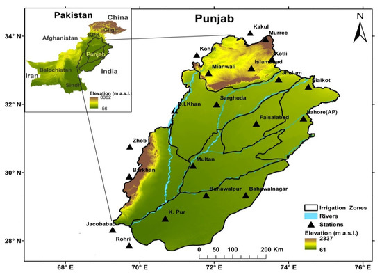 - Nawaz, Z.; Li, X.; Chen, Y.; Guo, Y.; Wang, X.; Nawaz, N. Temporal and spatial characteristics of precipitation and temperature in Punjab, Pakistan. Water 2019, 11, 1916. [Google Scholar] [CrossRef]