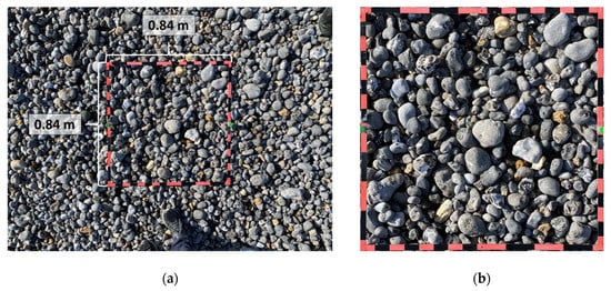 As the size of the image that can be input into the Mask R-CNN algorithm is limited for computational reasons, the ortho-images were cut out into tiles of 1 × 1 m² in size (Figure 8), to be analyzed one by one. Although convenient, the fixed size of 1 × 1 m² constrains the size of the detectable objects to smaller dimensions. Once detected, the pebble coordinates and dimensions are stored in an output table file containing all the previously detected pebbles of the entire ortho-image. The overall process takes around one day per ortho-image.