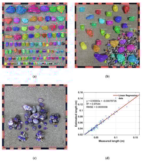The results show an average detection rate of 80 to 90% of the non-overlapping individuals, regardless of their arrangement (Figure 4a–c), with a R2 of 98% and an RMSE of 3.9 mm, i.e., 8 px (Figure 4c). Most undetected objects have a long axis of less than 2 mm, i.e., 4 px, and are among the smallest sediment particles that were measured. Other methods relying on the segmentation of photographs of quadra structures show a minimal detection threshold ranging between 8 and 23 mm [19,26,27,28,37]. On rare occasions, Mask R-CNN misclassifies partial clasts as complete ones. Among the 269 sediment particles detected through the 11 overlapping scenarios tested, only 10 individuals (the same ones in most cases) were misidentified as non-overlapped sediment particles while being overlapped, resulting in a misidentification score of 3.7%. Figure 4c shows the validation scenario presenting the highest number of misidentified features: elements n°4 and n°25.