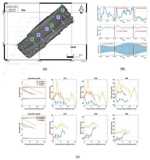 There is a greater elevation in the east than in the west, with, for example, profile A being lower than profile F, and with a similar relationship between profiles B and E (Figure 6c). This elevation reflects a greater sediment accumulation in the east due to the long-shore sediment transport phenomenon. The grain size evolution follows the same trend, with larger sizes also in the east for higher elevations (Figure 6c), which suggests the presence of a relationship between elevation and pebble size.