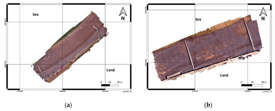 Two UAV campaigns were carried out in Hautot-sur-Mer and Etretat on June 9 and June 10, 2020. These campaigns made it possible to create ortho-images at the scale of the beach, with a resolution of 5 mm/pixel covering 9000 m2 at Etretat (Figure 7a) and 12,000 m2 at Hautot-sur-Mer (Figure 7b) using Surface From Motion (SFM) techniques. On both sites, the flight was carried out using a DJI Inspire 1 with a Zenmuse X5 camera (image size = 4608 pixels × 4608 pixels; sensor size = 17.3 mm × 13 mm; Focal length = 15 mm). Flights were attended at a fixed altitude of 20 m above the top of the beach, with an increase due to the beach slope up to 30 m at Hautot-sur-Mer and 35 m at Etretat. Therefore, the expected Ground Sampling Distance (GSD) values range from 5 to 7.5 mm/pixel at Hautot-sur-Mer, and from 5 to 8.8 mm at Etretat, and are correctly oversampled by the image resolution of 5 mm/pixel.