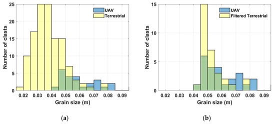 Comparison between the clast size distribution of a terrestrial sample (yellow) with a UAV sample (blue) at the same location, (a) before and (b) after applying the filtering processing.