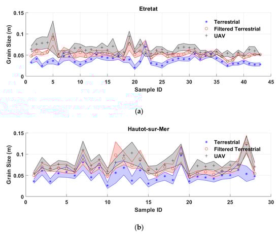 Figure 11a,b show the distributions (before and after filtering) of the clasts from the terrestrial samples as well as the distributions from the UAV samples, at Etretat and Hautot-sur-Mer, respectively. For the vast majority of samples, the filtering operation brings the terrestrial means significantly closer to the UAV sample ones, regardless of the site, which shows the relevance of this operation.