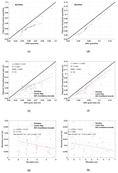 The quantiles–quantiles diagrams (Figure 11c,d) highlight a quasi-linear relationship between the filtered terrestrial and UAV sample quantile classes, although the UAV samples slightly overestimate these values.