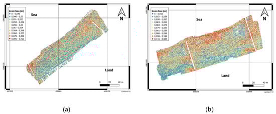 After the Mask R-CNN detection processing, detected sediment particles sizes were rasterized in order to be analyzed in an easier way (Figure 13c,d). The present rasters were produced by finding the quantile 50 of each cell of a grid of 1 × 1 m² in size covering the beaches.