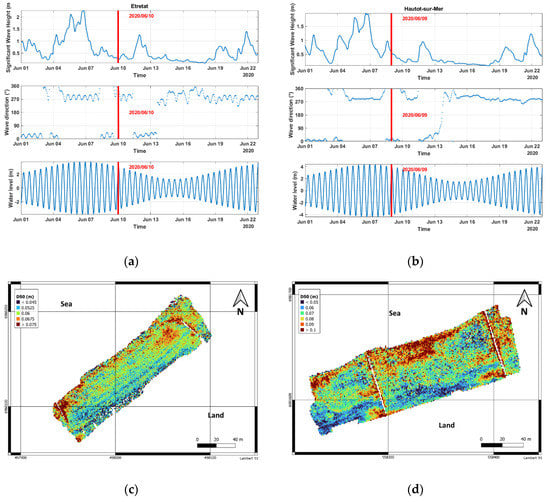 At both sites, the measurement campaign took place during a mildly agitated hydrodynamic period (hs < 1 m for several days) in the presence of a N–NW swell at the end of the spring tide (Figure 13a,b). A week before, these campaigns were preceded by a more energetic event with waves up to 2 m in height on both sites, during the spring tide peak.