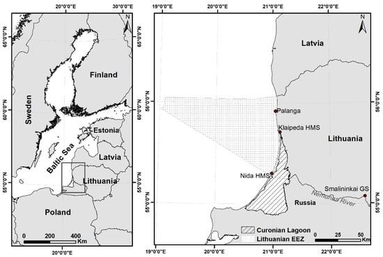 Map of the study site indicating the two subareas: the Curonian Lagoon and the Lithuanian coastal area (denoted as Lithuanian EEZ). The location of the Klaipeda coastal monitoring station is denoted as “Klaipeda HMS”, and the location of the Smalininkai gauging station as “Smalininkai GS”.