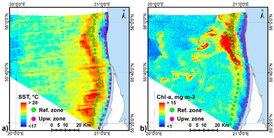 The Baltic Sea, with its unique geographical and biogeochemical features, has a particularly vulnerable ecosystem with a large coastal area in which eutrophication was first identified over half a century ago [1]. According to the Helsinki Commission (HELCOM)’s integrated status assessment [2], at least 97% of the region was assessed as eutrophied in the period of 2011–2016. The main triggers of eutrophication are considered to be excessive inputs of nitrogen and phosphorus, stemming from anthropogenic sources [3,4,5,6], while the loads of nutrients from natural sources, such as coastal upwelling, have been entirely neglected. The influence of upwelling has received relatively little attention in environmental status assessment programs such as the EU Marine Strategy Framework Directive (MSFD) or the HELCOM guidelines for the status assessment of eutrophication [7]. However, understanding the temporal dynamics and the variability of bio-physical properties such as chlorophyll-a (Chl-a) concentration and sea water temperature is an important task for assessing marine ecosystems and the water quality of coastal waters [8,9]. Chl-a is the major indicator of trophic state, acting as a link between nutrient concentrations and algal production, while water temperature is an important parameter for the physical and biochemical processes that occur. For example, the distribution, transportation, and interaction of some contaminants, such as nutrients, have a significant relationship to the water column temperature [10]. In turn, a number of studies have shown that the use of remote sensing data can be of great use in monitoring SST and Chl-a changes in areas affected by coastal upwelling, e.g., [11,12,13].