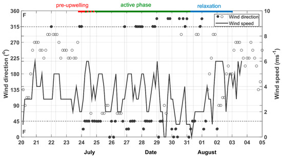 Wind speed and direction in Klaipeda HMS. ‘F’ symbol in the left corners and full black circles indicate upwelling-favourable northerly winds. The red bar indicates the time interval of the pre-upwelling phase, the green bar the upwelling active phase, and the blue bar the upwelling relaxation phase.