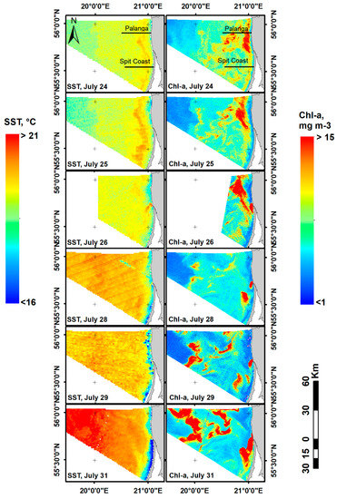 In the period of July 27–31 the upwelling-favourable wind conditions continued, and the strongest development of the upwelling front occurred, making it very distinct in the SST records (ΔT up to 5 °C). The more mature the upwelling became, the more severe was the drop observed in Chl-a concentration in coastal waters, with the lowest values (~3 mg m−3) recorded on July 27–29. At the same time, the Curonian Lagoon plume became very intense (Figure 5), and a clear trail of more productive waters (Chl-a concentration up to 50 mg m−3) steering to the south was evident on July 31. As can be seen from SST maps, the upwelling front was more pronounced to the south of the Klaipeda Strait than in the northern area, where it separated highly productive plume waters from the coast.