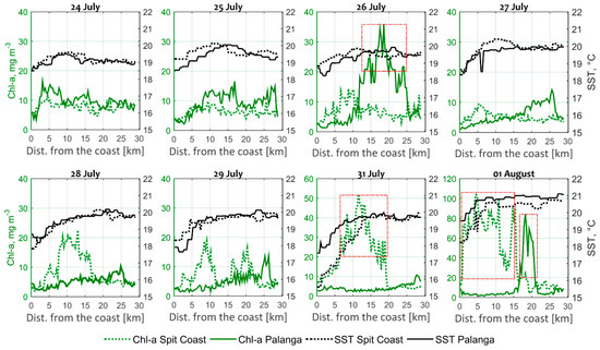 Variations of Chl-a and SST values along horizontal profiles near Palanga and the Curonian Spit (denoted as “Spit Coast”) during the upwelling event of July–August 2008. The locations of the cross-frontal transects near Palanga and the Curonian Spit are indicated in Figure 5. To better illustrate Chl-a variations due to the Curonian Lagoon plume, the Chl-a concentration axes limits in July 31 and August 01 differ from those of the other dates.
