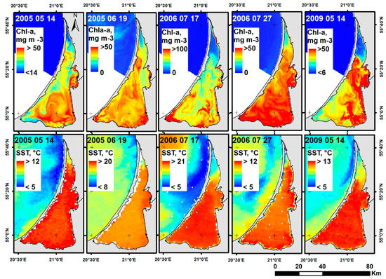MODIS SST and MERIS Chl-a maps depicting upwelling induced changes of SST and Chl-a concentrations on the coast of the south-eastern Baltic Sea and in the Curonian Lagoon. To better illustrate Chl-a and SST changes, colour bars differ between different dates.