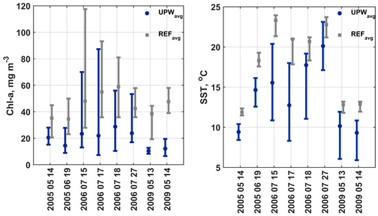 Satellite-derived Chl-a concentration and SST in the Curonian Lagoon: Chl-a concentration and SST in the upwelling inflow area is denoted as UPWavg and in the reference area as REFavg.