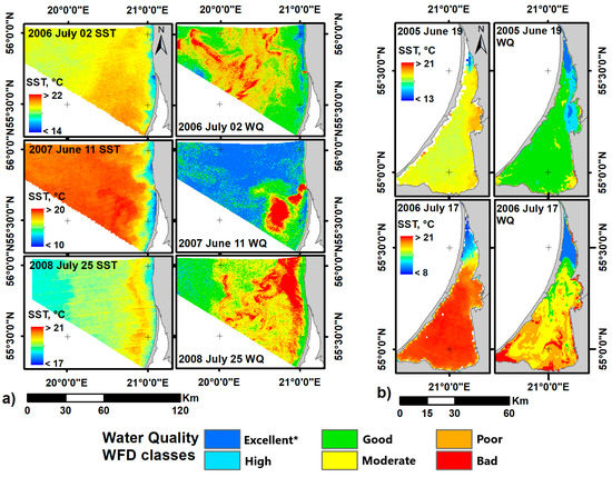 Available satellite data allowed us to investigate the effect of upwelling on water quality. The analysis of the Chl-a and SST images of the SE Baltic Sea region shows that through the reduction in Chl-a concentration, the effect of upwelling could be linked to better water quality in the coastal zone compared to pre-upwelling periods or offshore regions. Several examples showing WFD water quality classes based on Chl-a concentration along the SEB coast and in the Curonian Lagoon are presented in Figure 9. This demonstrates that upwelling-affected waters can be distinguished from ambient ones as having better quality based on the WFD water quality classes.