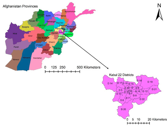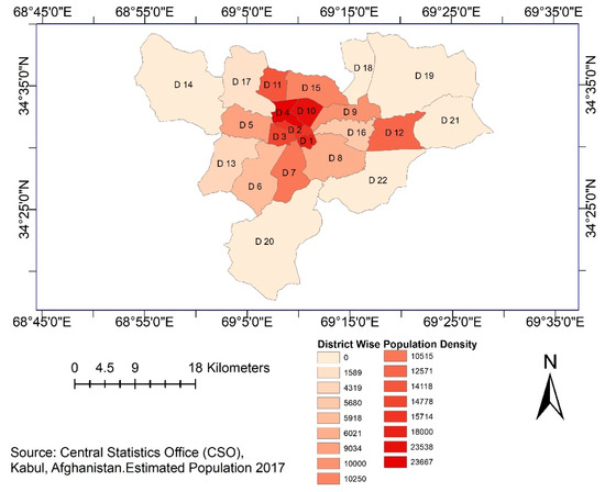 The city of Kabul, capital and largest city of Afghanistan is located in the eastern part of the country at 34° 32′ 38.0256″ N and 69° 9′ 38.3472″ E, and at an elevation of 1798 m above sea level. Kabul is also a municipality forming a part of the Kabul Province. Kabul city is divided into 22 districts called “Nahiyas”. Figure 2 shows the geographical location of the city. Kabul is the fifth fastest-growing city in the world; its population has grown from about 1.5 million in 2001 to around 5 million people in 2015. The rapid urbanization has not been able to keep up with the demands of the growing population in a city, which was originally designed for around 700,000 people. This caused about 70% of the inhabitants of Kabul to live in informal areas, which have been developed without formal planning [20]. The total built-up area of Kabul city region is 40,143 ha, out of which 17,335 ha is for residential use and 1006 ha for commercial use [21]. The primary factor and the driving force behind the urban land expansion of the city is economic growth [17].