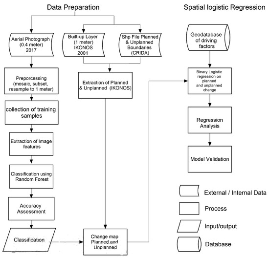 Using as input the built-up layer extracted from the IKONOS imagery of 2001 and the land cover/use map of 2017, spatial logistic regression is used for identifying factors impacting the growth patterns. The data is acquired from various secondary sources. The data was collected from different sources in Kabul, government publications and data provided by JRC (built-up layer extracted from IKONOS imagery of 1 m resolution). The imageries procured from CRIDA were of poor radiometric quality, the best imagery was chosen for further processing. The changes in the planned and unplanned settlements are analyzed using high-resolution aerial photograph provided by CRIDA and built-up layer provided by JRC were used for processing. The flowchart (Figure 5) shows the process followed.