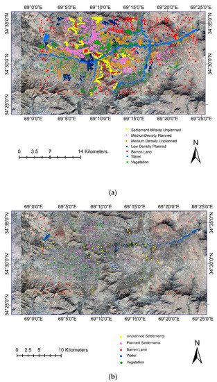 Aerial photographs for the year 2017 showing the location of (a) training samples and (b) reference samples.