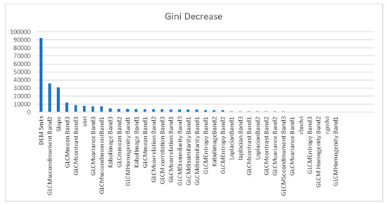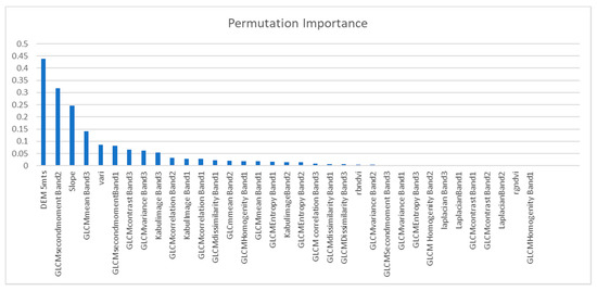 The classification was performed using all the 35 image features. As can be seen from the graphs Figure 8 and Figure 9, DEM (dDigital elevation model) and slope have high permutation importance and Gini decrease values. In the category of texture features, the features with high permutation importance and Gini decrease are GLCM second moment Band 2 and Band 1, GLCM mean Band 3. Among the spectral feature VARI (Visible Atmospheric Resistance Index) has a high permutation importance and Gini decrease. The original bands 1 and 3 of the aerial photographs have a high permutation importance and Gini decrease. The output of the classification is shown in Figure 10.
