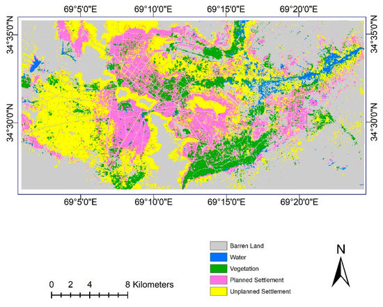The built-up layer for the year 2001 with 1 m resolution extracted from IKONOS is used to map the change in planned and unplanned from 2001 to 2017. The accuracies of the classified aerial photograph with three classes and the built-up layer extracted from IKONOS is comparable with 75% accuracies for both maps. This helped in improving the regression model. The urban morphology of the city of Kabul is complex; therefore, the availability of infra-red band for the year 2017 of an appropriate resolution would have helped for a more accurate classification.