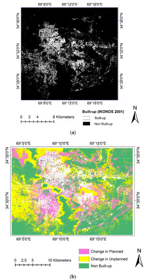 (a) Built-up extract from IKONOS 2001, (b) change in planned and unplanned from 2001 to 2017.
