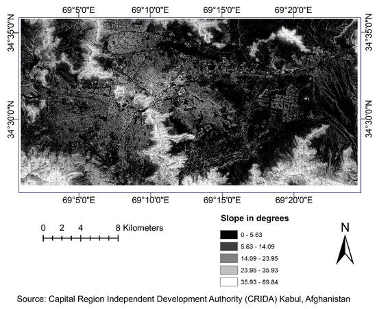 The total built-up area calculated for the planned settlements in 2001 is 71 km2 and in 2017 is 94 km2. Thus, the growth in the planned settlements from 2001 to 2017 is 22 km2. Planned settlements increased by 1.25 times from 2001 to 2017. The total built-up area calculated for unplanned settlements in 2001 is 21 km2, and in 2017 is 114 km2, and the growth in unplanned settlements from 2001 to 2017 is 94 km2. The unplanned settlements have grown 4.5 times in the period from 2001 to 2017, as shown in Table 7. The tremendous growth in the unplanned settlement is peculiar to Kabul, being the capital of Afghanistan compared to the other cities because of the largest presence of military bases, NATO base and Afghan troops in the whole country, giving a feeling of security to the population apart from economic opportunities in the city. As can be seen from Figure 11, unplanned growth is mainly on the west, north west, south west and on the hillsides. The settlements on the hillside are all unplanned. A large part of the planned growth is on central, east, north east and southern parts of the city. There is some planned growth on the northeast. Therefore, from the results, it can be said that the unplanned growth has occurred mainly in the western parts of the city, whereas, the planned growth is mainly towards central and eastern parts of the city. Overall, it can be said that Kabul is a sprawling city because of low rise and medium-density built-up. The increase in the unplanned sectors happened through the conversion of large agricultural lands into built-up areas, as well as the conversion of land on the steep slopes on the hills. Slope has been shown in Figure 12. These conversions drive the city sprawl. Most of the houses in the unplanned settlements are separated dwellings and have a central courtyard and similar building material, as found in the planned settlements, which is clearly visible on the aerial photograph, making it difficult to distinguish the built-up types.