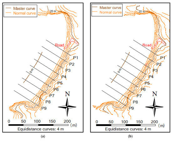 Through analyzing the digitized top and toe lines of the 1956 and the five maps done by photogrammetric methods for the (2001–2017) period, no significant height changes were detected (Figure 5). The planimetric elements that were extracted from the map were the road for the access to the beach and the cliff top line, as well as the contour of the landslides (Figure 6a). The height contours were also represented with an equidistance (normal curves) of 2 m and master curves every 10 m.