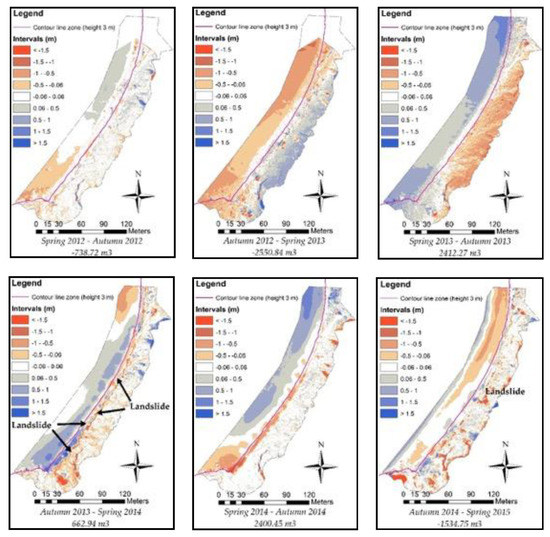 - The volumetric values that occurred above the base line of the cliff (3 meters above sea level) were also analyzed. At 3 meters altitude, small landslides occurred (for example, between the fall of 2013 and the spring of 2014). There were also large landslides across the cliff (for example, between the fall of 2017 and the spring of 2018). Throughout the study period, the total loss of material that occurred in the cliff area was −3633.32 m3.
