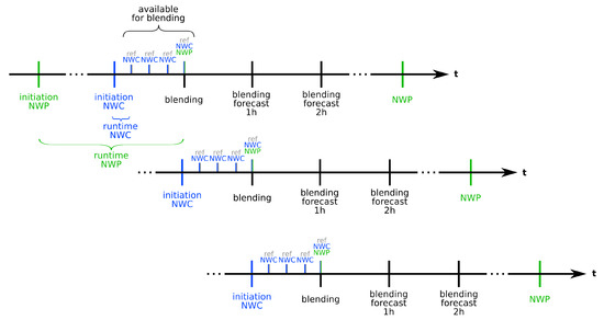 Scheme of the temporal availability of the input forecasts for a blending with ANAKLIM++ (adjustment of assimilation software for the reanalysis of climate data). The distance of the depicted forecasts is proportional to the time range in which they are available. The dots on the line mark a break in the time line due to a changing temporal availability and differing runtimes of the utilized NWP (numerical weather prediction) models. For each blending 1 h of NWP, NWC nowcasting and reference needs to be available. The procedure can be repeated every hour.