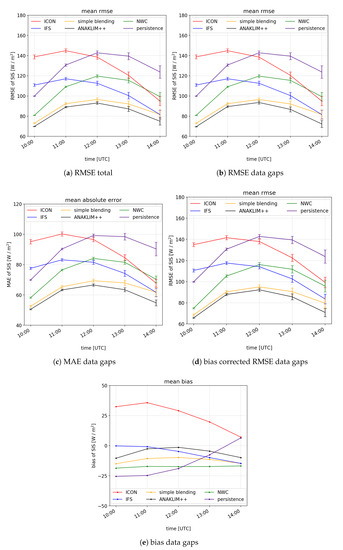 Figure 4b,c show the mean RMSE and mean absolute bias of all examined cases in dependency of the time of day. However, the time of day does not equal the lead time of these forecasts. As already mentioned in Section 2.1 only those model runs were used that would be available for a blending at 10 UTC; therefore, the 06 UTC run from ICON and the 00 UTC run from IFS are used. Moreover, the nowcasting and the persistence started at 09 UTC because one hour of SIS is needed as input. For better understanding the reader may want to look at the scheme of the temporal availability of the different data sets in Figure 1. Figure 4b,c show the error measures for a version of the blending where the nowcasting with data gaps is used. Both look quite similar because the RMSE and MAE of the blending with ANAKLIM++ are the lowest of all forecasts throughout the entire validation horizon. It is also similar in both figures that ICON shows the highest errors at the beginning and towards the end of the blending the persistence forecast has the highest errors. Moreover, the performance of both NWP models is slightly improving with forecast time, while the errors of the nowcasting and persistence slowly increase. A little surprise is that a simple blending approach can outperform the other forecasts. After a forecast time of 4 h, the difference between ANAKLIM++ and the simple approach becomes slightly larger, but all in all both blendings improved the quality of each forecast before the blending. Another similar behavior is that both error measures show a decrease for all forecasts towards longer lead times which is owed to the sunset. In Urbich et al. [51], it was already proved that this behavior is related to the sunset, since relative error measures did not decrease in the same manner. Figure 4a also depicts the RMSE of all examined cases. In addition, this figure shows the results of a blending utilizing ANAKLIM++, where the nowcasting data was used completely therefore no regions were cut out, see Figure 2c in comparison to Figure 2d for further details. This comparison shows that the approach of error filtering leads to a significant improvement (lower RMSE) after approximately 2 h forecast time when errors in the nowcasting get bigger and larger parts are being cut out in the version with data gaps. Simultaneously, the quality of the NWP models increases especially in comparison to the nowcasting. Therefore a blending with gaps in the nowcasting data in regions with high potential of errors can lead to lower error measures. In order to assess the quality of forecasts in the scope of energy meteorology it is crucial to consider the error spread as well. A low error can be misleading that the overall forecast quality is high for all weather situations. However, a misinterpretation of the forecast due to lack of information can affect grid stability. The error bars in Figure 4a–d depict the empirical variance v (Equation (8)) thus it represents the spread of the error measures of the investigated cases. Because the simple blending only utilizes IFS for a lead time of 5 h both forecasts will always have the same size of error and variance. All forecasts show a rising spread with increasing lead time. Further, the spread of ANAKLIM++ is smaller than that of the simple blending for all presented error metrics.