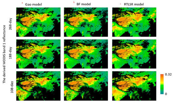 The retrieval was performed based on the three models (e.g., RTLSR model, Gao model, and adjusted BF model) for different inversion periods (e.g., 108 days, 188 days, and 268 days) from 2012 to 2015. First, we selected the derived MODIS band-1 reflectance on the 216th day of the year in 2012 as an example to analyze the performance efficiency of the models (see Figure 3).