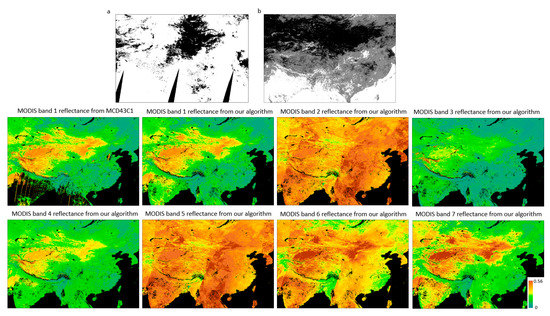 The results in Figure 5, as an example, shows a seemingly rational spatial distribution, particularly in the southwest part of China (e.g., the part of Sichuan Province and in the Yunnan–Guizhou Plateau region) and in southern Asia including the South Asian Sub-Continent and Southeast Asia, in which clouds are predominant for the majority of months of the year. For the derived MODIS band-1 reflectance calculated from the MCD43C1 V006 parameters in Figure 5, there are many abnormal values in Sichuan Province, the Yunnan–Guizhou Plateau region, South Asia and Southeast Asia because filling and even invalid values are used. The reconstructed MODIS-band 1–7 reflectance result displays optimal spatial continuity and an acceptable spatial distribution (Figure 5).