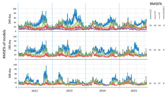 Daily mean RMSE% of the time series of the derived MODIS band-1 reflectance from the 1st day of the year in 2012 to the 298th day of the year in 2015 by the Gao model, RTLSR model and adjusted BF model with the different inversion periods: 108-day period, 188-day period, and 268-day period; and the statistic of total daily mean RMSE% is show the right part.