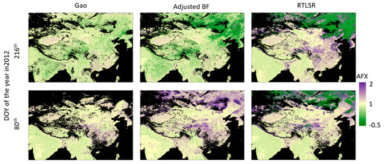 Besides the aforementioned discussions, an interesting analysis is introduced by comparison of the difference in the spatiotemporal distribution of the AFX derived by BRDFs’ parameters at MODIS band-1 reflectance on the 80th day and 216th day of the year in 2012 (see Figure 8) based on the AFX equation (Equation (6)) [29].