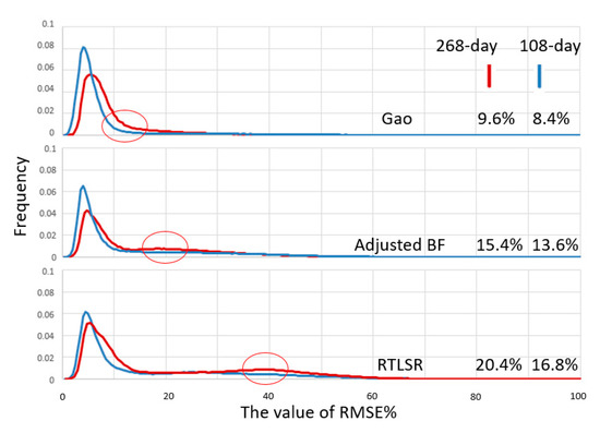In addition, MODIS band 1–7 reflectance values from MODIS observations and derived by the three models are used to convert NTOB shortwave land surface reflectance data (Table 4). The resulting histograms show that the precision of the derived land surface reflectance based on the models varies. From the histograms (see Figure 9), when the inversion period expands from 108 days to 268 days, the RMSE% results of the Gao model plot between 5% and 10%, and those of the adjusted BF model and RTLSR model shift upward (e.g., by 20% for the adjusted BF model and 40% for the RTLSR model). In Figure 9, the red circle denotes the shift which quantifies the ability of models restraining the retrieving error while the inversion period expanding. Obviously, The RMSE% of the Gao model is always best with no more than 10%, and that of the adjusted BF ranging from 13.6% to 15.4% comes second, which corresponds to the features of the “shortwave” column in Table 2.