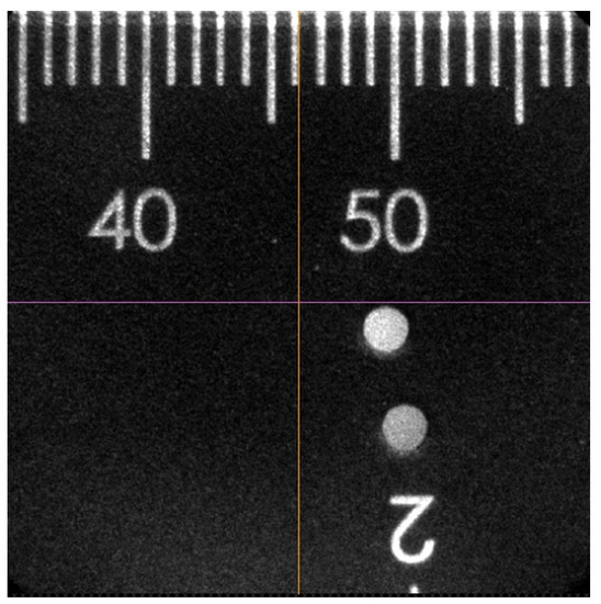 To project the image on the telescope focal plane onto the ICCD active area, a Canon zoom length with 200 zoom capability is adapted here to match the telescope FOV. By utilizing its maximum zoom capability, we projected a Thorlabs steel ruler that is placed on the telescope’s focal plane onto the ICCD active area (Figure 2) to quantify the resolution of this Na imager. The two dots are parts of a symbol on the ruler. As the figure shows, the ICCD covers an area of 23.5 mm × 23.5 mm in the telescope’s focal plane, corresponding to 3.8 mrad FOV. Based on this, considering that the ICCD active area has 1024 × 1024 pixels (13 mm × 13 mm), the instrumental horizontal resolution is ~3.7 μrad per pixel. However, it is worth noting that the astronomical measurements above an astronomy observatory are mostly about 4.8 μrad, i.e., larger than this instrumental resolution. Since the Cassegrain telescope used for this experiment does not have an adaptive optics system, the actual horizontal resolution is worse than the calculated results above.