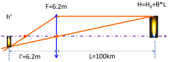 The basic optical principle of the Na imager is illustrated in Figure 3, where L is the object distance and l′ is the image distance, H is height of object and h′ represents height of the image. The focal length of the telescope is 6.2 m. Based on the Gaussian lens formula of geometric optics under paraxial approximation, , the image distance, l′, for the Rayleigh signal at 30 km altitude and Na fluorescent signal at 100 km altitude are 6201.3 mm and 6200.4 mm, respectively, leading to a distance of 0.9 mm between the two images, i.e., much less than the focal length, F. Thus, to simplify, we can treat . Because of the laser beam divergence, the sizes of the beam spots (section of Na layer “illuminated” by laser) at different altitudes are different. Since the dimension of the beam spot at far field, for example, at an altitude of 100 km, is much larger than that at near field (right out of the beam expander the beam spot diameter along the short axis is H0 = 0.05 m), we can ignore the contribution from the dimension of the near field, and calculate the size of the image of the far field beam spot on the telescope focal plane as: