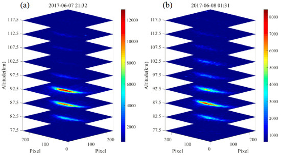 Multi-Na layer imaging experiment conducted at local time 21:32 on 7 June (a) and at 01:31 on 8 June (b) 2017, respectively. Horizontal axis is the number of pixels.