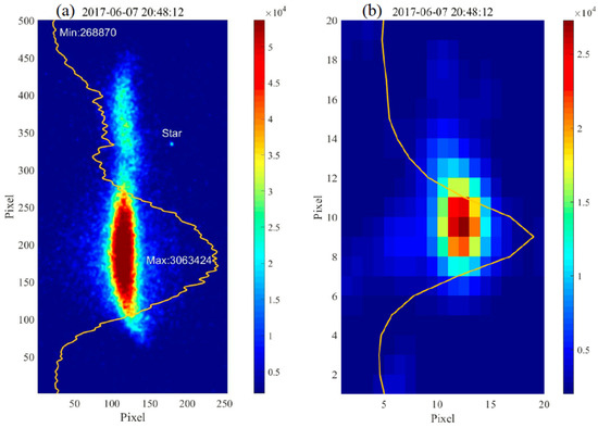 The simultaneous Rayleigh spot around 20 km altitude (80–300 pixel vertical) and Na spot (320–425 pixel vertical) averaged between altitudes of ~80 km and 120 km. The unit of both axes is “number of pixel”. The image to the right is a zoomed-in picture of a star that happened to be in the FOV during the experiment.