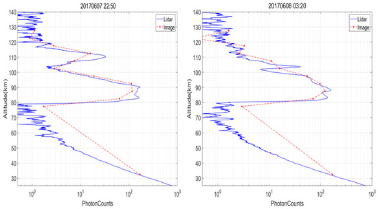 In addition to the ability to reveal the horizontal structure of the layer, these Na layer imaging data, including the Rayleigh imaging, can also be utilized to calculate the Na density vertical distribution through traditional Rayleigh power normalization, because the brightness of the image (intensity of laser-induced Na fluorescence) is linearly proportional to the Na number density at each altitude, as we described earlier. A similar technique has also been utilized to derive the Na density profile from lidar observations using a continuous high power laser system [22,23]. The potential capability of the multilayer Na imager is demonstrated in Figure 6, where the Na fluorescence intensity measurements from the Multilayer Na imager at two different local time are compared with the photon counting profiles from simultaneous Na lidar observations, showing good agreement between the two instruments. It has to be pointed out that the imager intensity is scaled by a factor of 3.6 × 10−5 after the background subtraction, to match the order of magnitude of the lidar photon profile. Thus, when running alongside of high power adaptive optics system operating at Na D2 line hosted in a large astronomical observatory, this Na imager could simultaneously measure the Na number density profile, providing important information regarding the Na beacon altitude [24].