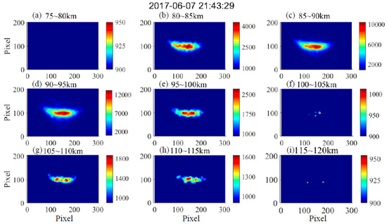 Layout of the Na layer images at six altitude ranges (every 5 km): 75–80 km (a), 80–85 km (b), 85–90 km (c), 90–95 km (d), 95–100 km (e), 100–105 km (f), 105–110 km (g), 110–115 km (h) and 115–120 km (i), conducted on 7 June 2017.