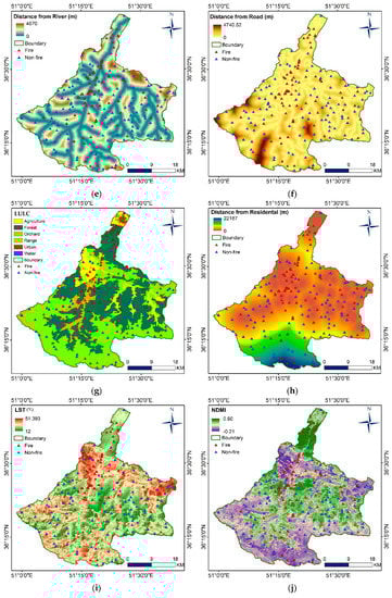 Several studies have mapped or predicted forest fire basically using satellite-based approach [10,18]. However, limitations arise with respect to the accuracy of the prediction where the topographical factors such as effect of shadow cast by steep slope and terrain ruggedness and environmental conditions such as accessibility to or human activities are not considered [13]. Therefore, this study systematically incorporates 14 geo-environmental factors (Figure 3) to predict fire susceptibility in the study area: four from topographical data (altitude, aspect, slope and curvature); three from vector data layers (distance from residential area, river and road); six from Landsat 8 imagery (land surface temperature (LST), normalized difference moisture index (NDMI), normalized difference vegetation index (NDVI), soil adjusted vegetation index (SAVI), land use and land cover—(LULC)); and finally, two climatic indices—air temperature and rainfall.