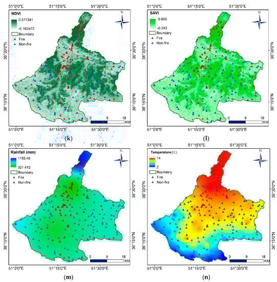 Forest fire conditioning factors: (a) altitude, (b) aspect, (c) slope, (d) curvature, (e) distance from river, (f) distance from road, (g) distance from residential, (h) LULC, (i) LST, (j) NDMI, (k) NDVI, (l) SAVI, (m) rainfall, (n) temperature.