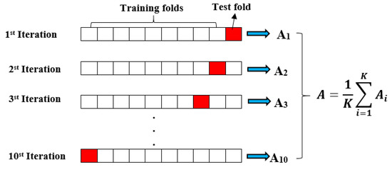 CV is a resampling method commonly employed in classification problems to assess the suitability of a statistical model. In principle, CV randomly splits the sample data into model building and test dataset for assessment of the models’ performance accuracy for prediction. This approach eliminates bias in sampled data and prevents under/overfitting of the model during optimization [39]. In this study, 5- and 10-fold CV implementation scheme were used. Figure 4 presents CV implementation schema.