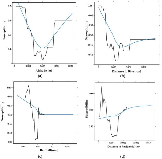 Response curve of variable importance: (a) altitude, (b) distance from river, (c) rainfall and (d) distance from residential using the lattice-based PDP.5.