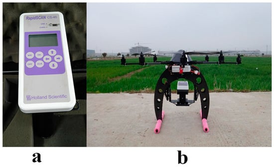 (a) The RapidSCAN CS-45 canopy sensor, (b) unmanned aerial vehicle (UAV) equipped with the RapidSCAN CS-45 sensor.