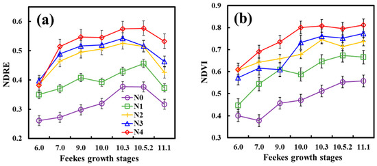 Dynamic variation in the (a) normalized difference red edge (NDRE) index and (b) normalized difference vegetation index (NDVI) with Feekes growth stages. Data were collected from Experiment 1 using the Huaimai20 variety. Vertical bars at each sampling date represent the standard error.