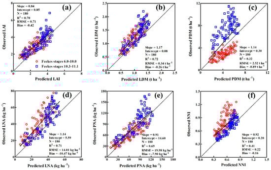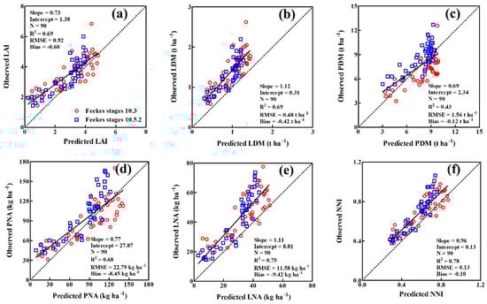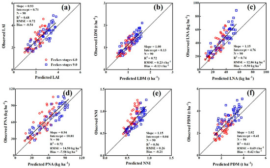 Validation results obtained using the model based on the difference vegetation index (DVI) to predict (a) leaf area index (LAI), (b) leaf dry matter (LDM), (c) plant dry matter (PDM), (d) leaf nitrogen accumulation (LNA), and (e) plant nitrogen accumulation (PNA) and the model based on the red edge ratio vegetation index (RERVI) to predict (f) nitrogen nutrition index (NNI) across all growth stages. Solid black lines indicate regression lines and dotted black lines indicate 1:1 lines.