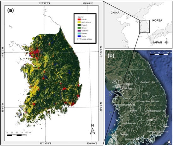 The study area included the inland areas of South Korea: approximately 99,827 km2 (latitude 34° N–38.5° N & longitude 126° E–129.5° E) divided into 16 regional local governments (Figure 1). The dominant land-cover categories of the study area are forest (67.7%), agricultural land (22.2%), urban areas (4.6%), and others, including grassland, water, barren land, and wetlands (5.5%) []. South Korea experiences damage to the natural environment in various forms and magnitudes owing to natural disasters such as flood due to rainfall, soil erosion due to wind and gravity, as well as human activities such as land development and road construction []. Additionally, socio-economic damage is also increasing owing to the deterioration of ecological health, disconnection with adjacent ecosystems, and inhibition of natural landscapes in the damaged area. However, since the locations of and information about the damaged areas are not known in advance, specific policies or prior plans are not established, and sporadic restoration projects are being carried out by government departments []. Figure 1 is the general land cover status of South Korea provided by the Ministry of Environment (MOE) [].